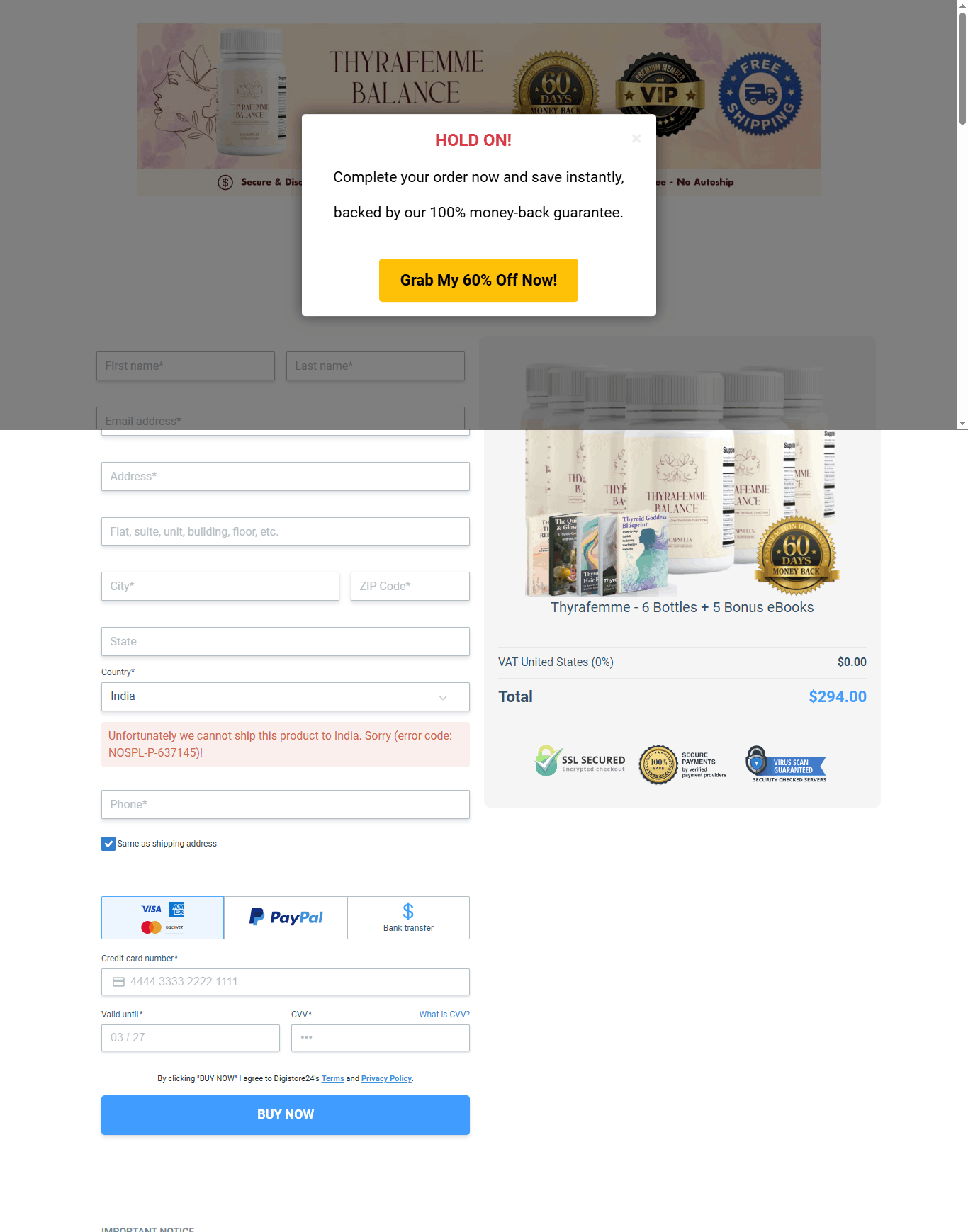 Absolutely — your credit card and personal information are 100% safe and secure when you place an order for Thyrafemme. Our website uses advanced SSL (Secure Socket Layer) encryption technology, the same level of security used by major financial institutions. This ensures that all transactions and personal data are completely protected from unauthorized access.